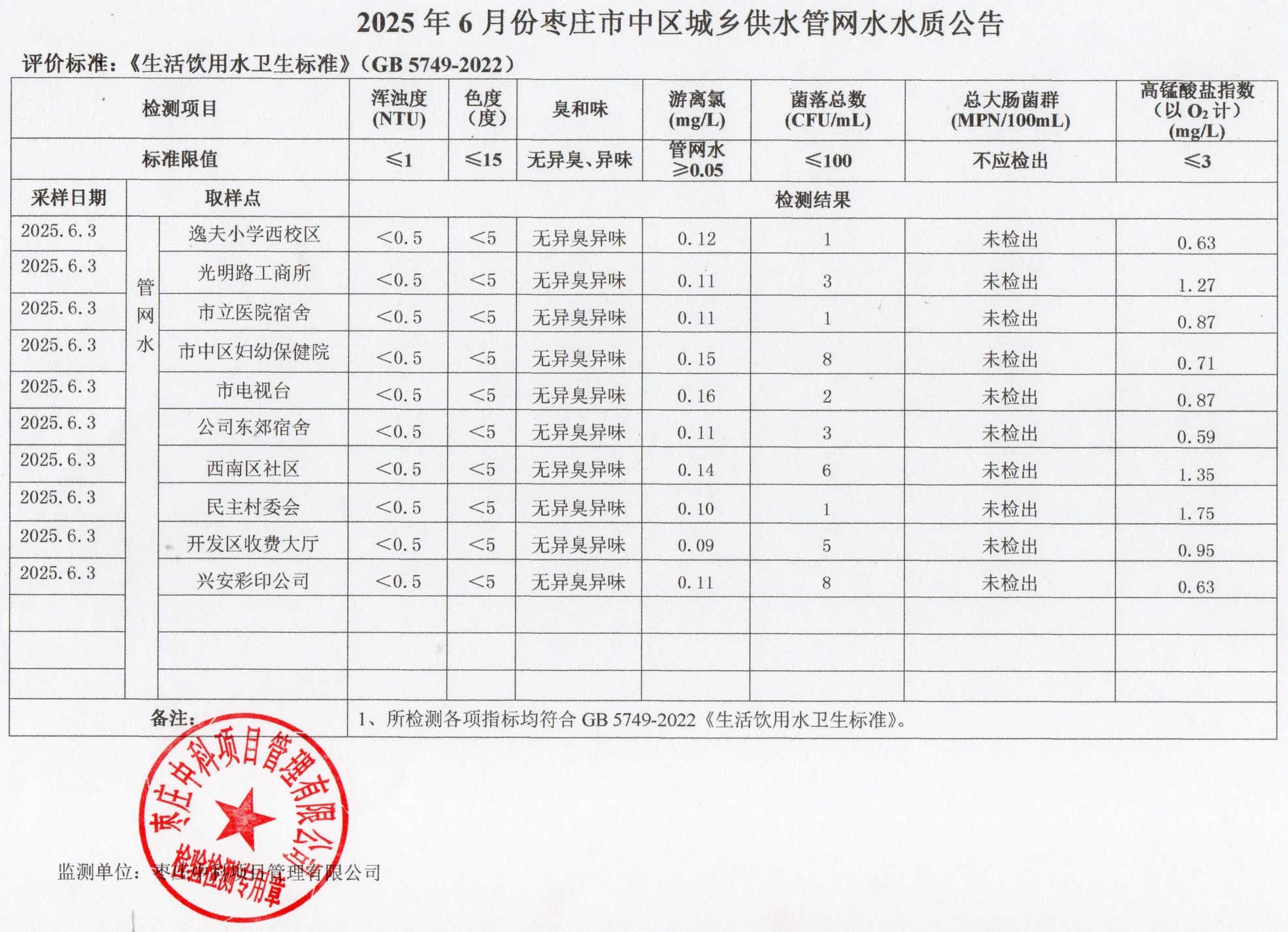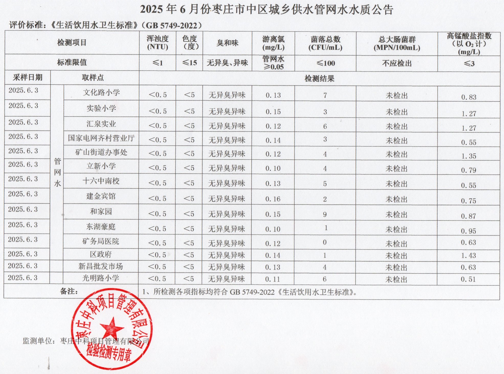 • 标  题:2025年6月份枣庄市中区城乡供水出厂水质公告